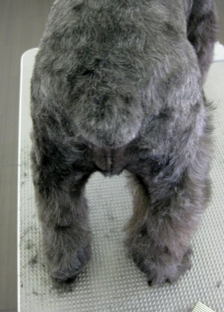 シュナの場合通常、しっぽの裏側もバリカンを使用するのですが、ベリーくんはハサミで汚れにくくスッキリと、表はまん丸シッポです~(>_<)
