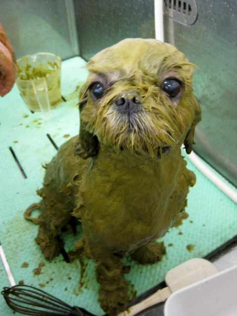 シーズーは、お顔のしわの部分に汚れがたまり、炎症やにおいが出やすいので、しっかりとパックしました!!