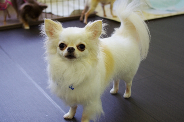 クリームのロングコートチワワが、うるるちゃん。