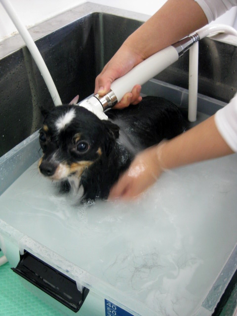 通常は、シャンプー→コンディショナー→ブローをしますが、シニア犬などの場合は、シャンプー→スプレートリートメント→ブローに変更しています。