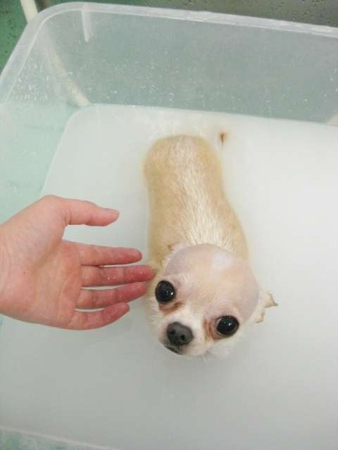 とっても小さいので、お風呂の中で浮いてしまわないように入浴してもらって、背中やお顔はマイクロバブルのノズルでかけ湯をしました☆