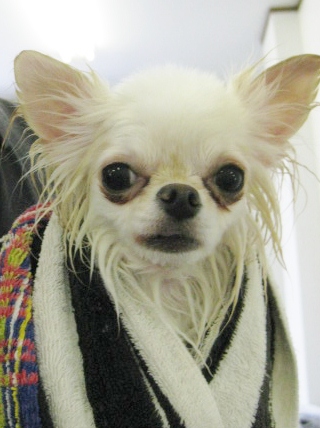 タオルにくるまれている、シャンプー後のうるるちゃん(p_-)