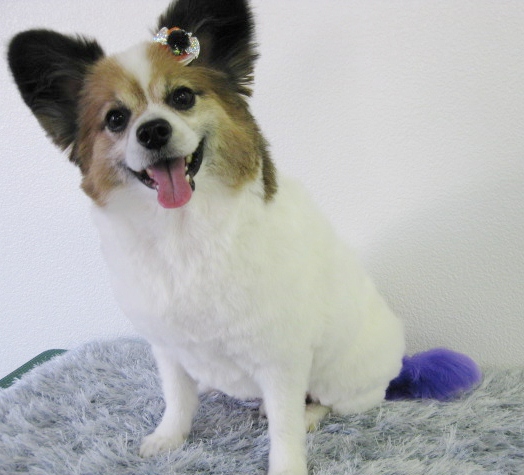 チョコのシッポは根元がブラウン、先が真っ白の毛色なので、パープルにカラーリングをしたら、ブラウンとパープルの相性が良くて、とっても似合っていました☆