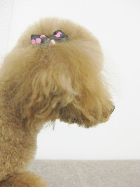 リボンは、皮膚に負担になることがあるため、いつも耳リボンをご希望のワンちゃんの場合、リボンをつける位置を毎回変えています。
