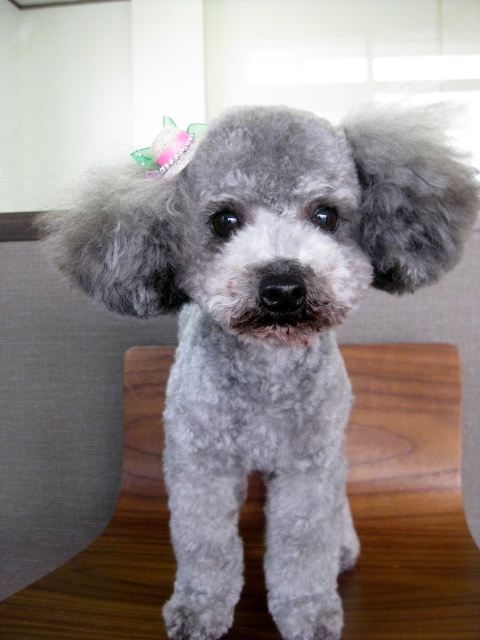 前回はフワフワ感を残したカットでしたが、今回は、サマーカットで!!とのご要望で、体はスッキリと短く、お顔まあるくカットさせていただきました。