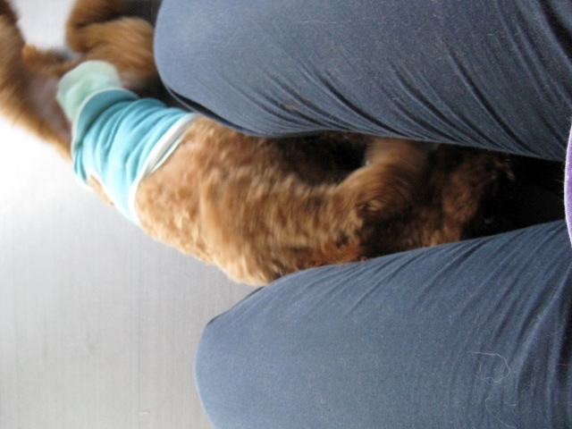 おしっこの上でコロコロしてはいけないので、マナーバンドをしてもらったら、慣れていないようで、テンション下がっていました(=_=)↓
