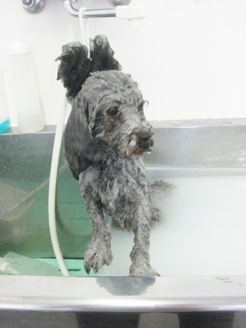 ミルキーちゃんは、地肌の脂分が多く毛量も多いので、通常のシャンプーでは、皮脂を落としきれないので、マイクロバブルで地肌を清潔にします!!