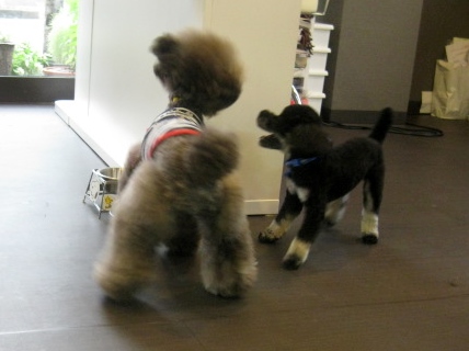 いつも、お客様が見えると、威張り散らしてしまうダイアですが、大好きなポンくんが来ると、ケンネルの中のポンくんに夢中になります♪