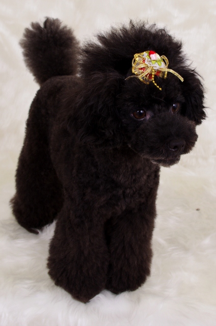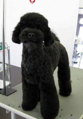 写真では明るめに写るように加工していますが、お顔が解らないくらい真っ黒くろの毛色&すぐにペッちゃんこになってしまう軟毛なので、できるだけメリハリのあるカットをして、プードルの愛らしさと、童顔なシェイのお顔がかわいく見えるようにしています。