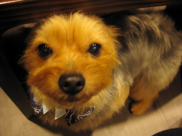 トリミングの後、自由にしているところを写真を撮ろうとしたら、ミックはいそいそとテーブルの下へ・・・。