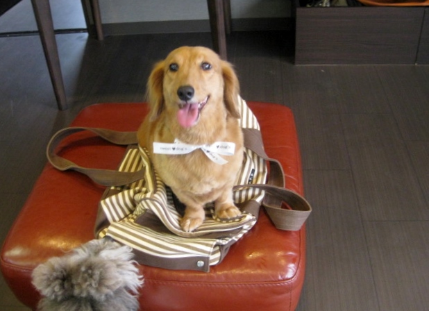 お店を自由に歩いてもらっても、自分のお気に入りのバックをお鼻で見つけて、乗っかっていました(p_-)!!