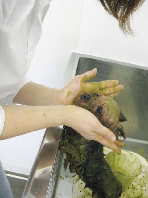 ハーブパックは、たっぷりと、被毛だけでなく皮膚にいきわたるようにヌリヌリ!