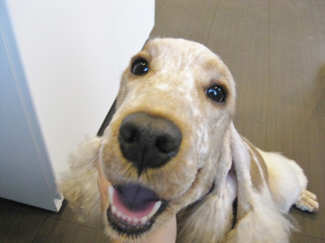 シャンプーブローが終わった後、ちゃんと、オスワリもオテも、マテも、お利口にしてくれるんですが、おやつ欲しさにずりずりカメラに接近し続けて(爆)